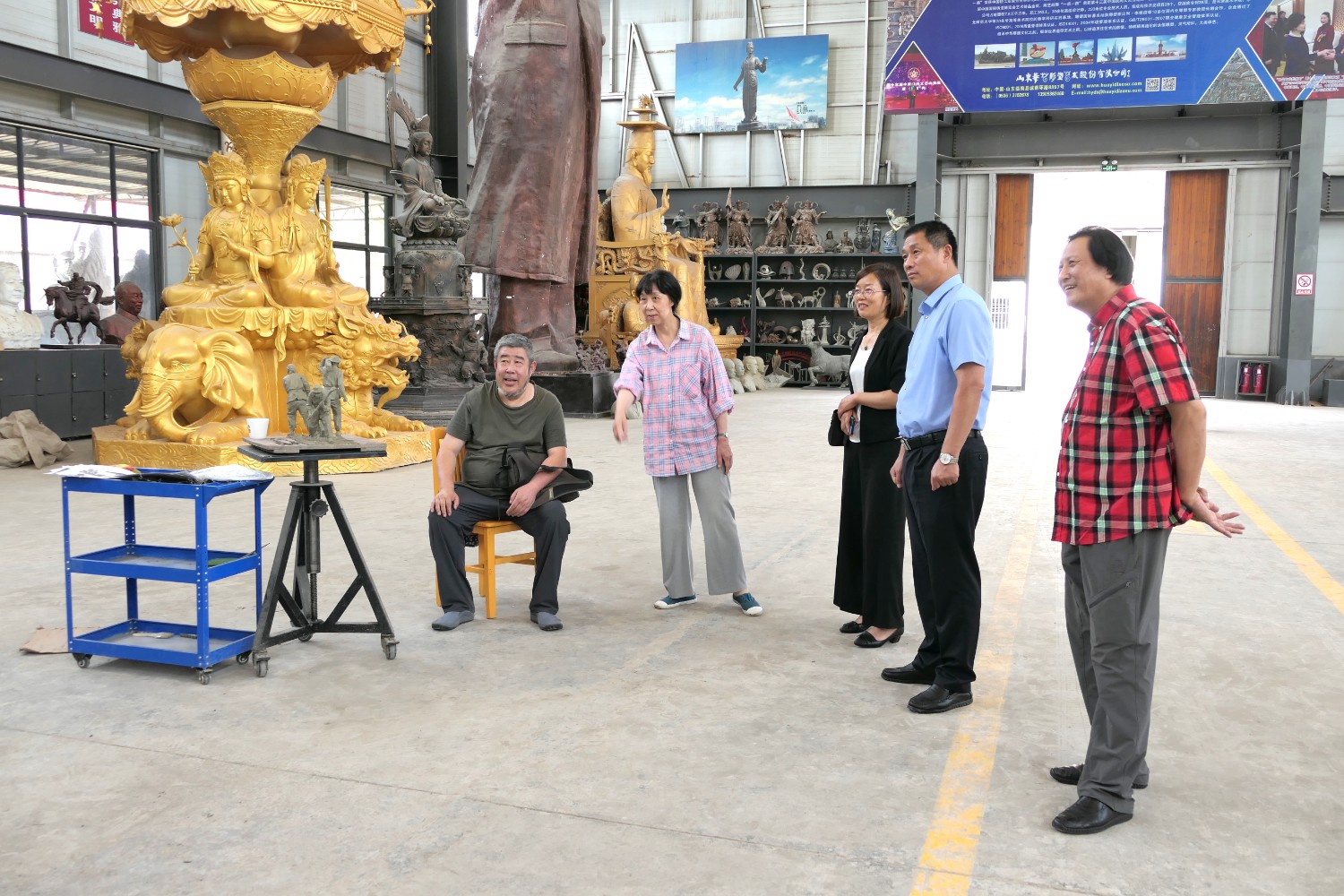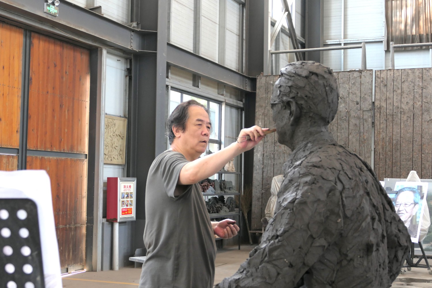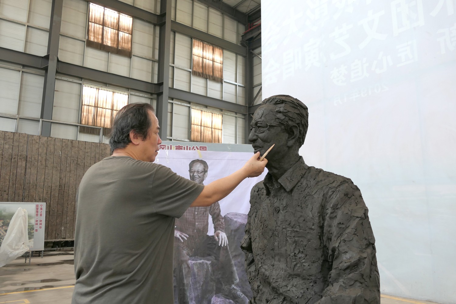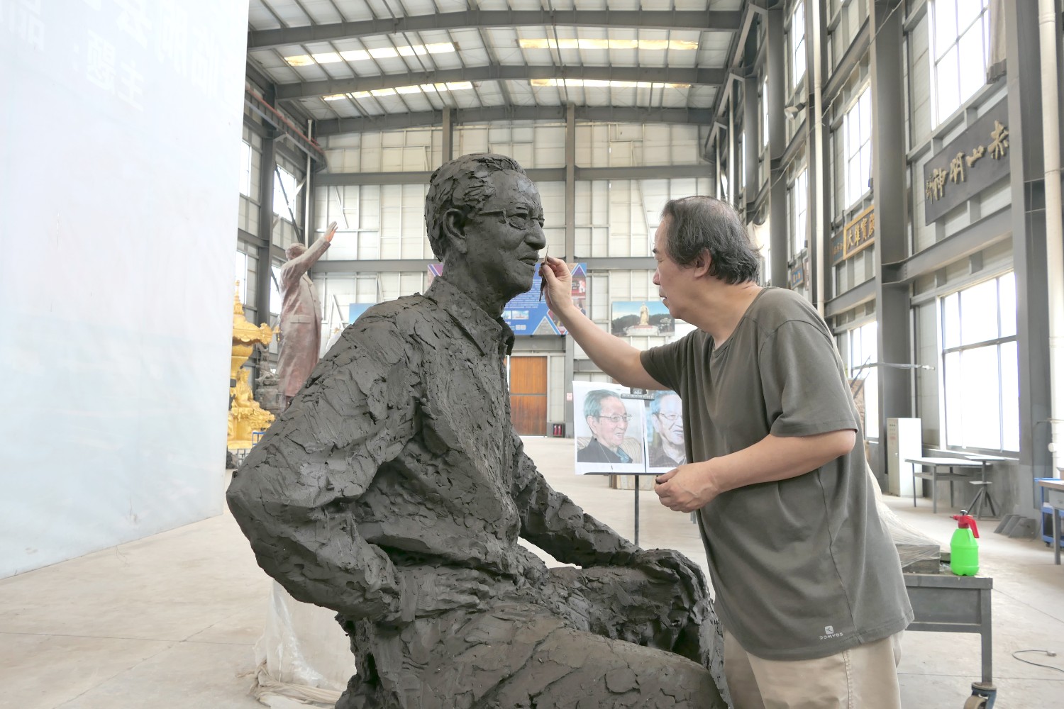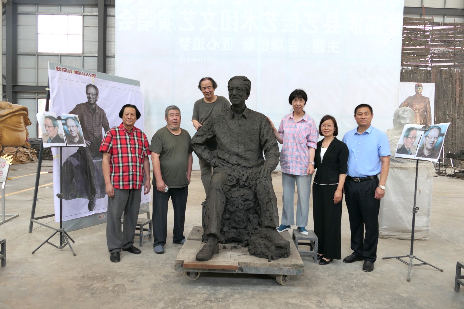 2022年6月11日,雕塑藝術(shù)家張永見(jiàn)先生,蒞臨華藝參觀指導(dǎo),并在雕塑家郭心聰塑造的楊辛(北京大學(xué)哲學(xué)系教授)雕像泥塑前合影留念。