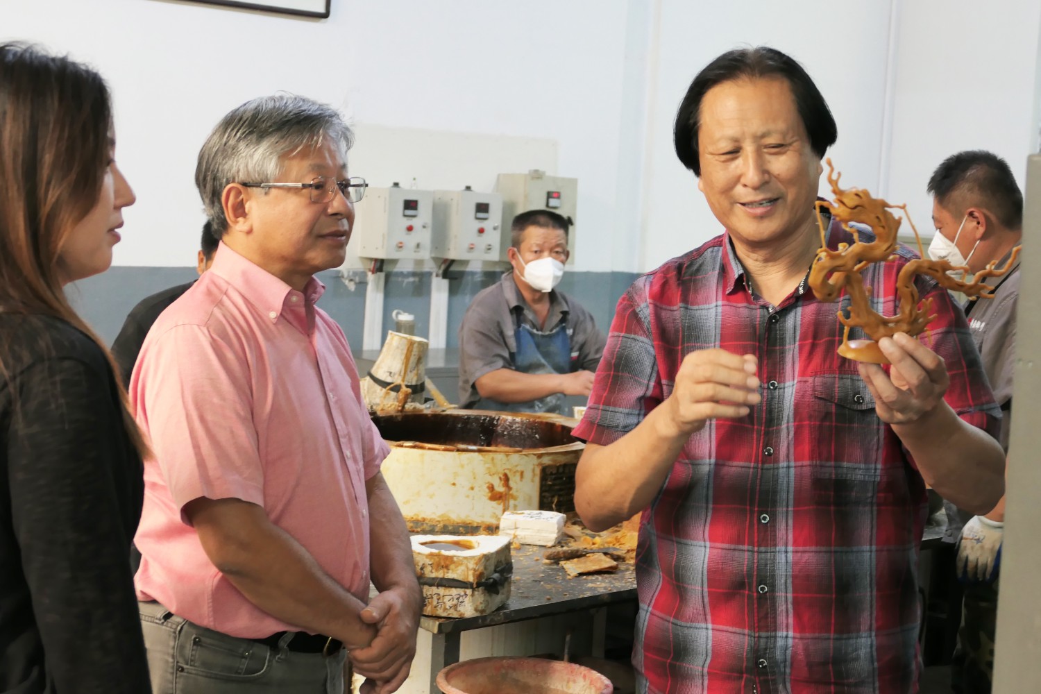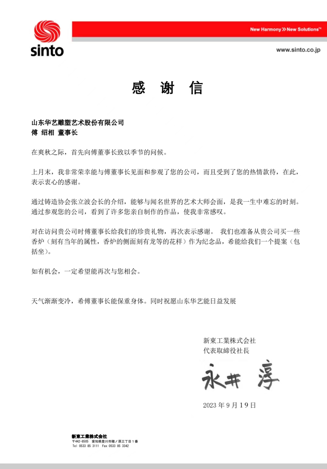 2023年8月30日,青島新東機械有限公司(日本新東工業(yè)株式會社與青島華通國有資本運營(集團)有限責任公司共同創(chuàng)建的合資企業(yè))永井社長、西原典男總經(jīng)理、葛穎麗主任等一行,蒞臨華藝雕塑參觀指導(dǎo),并洽談合作業(yè)務(wù),中國工藝美術(shù)大師、華藝雕塑董事長傅紹相、華藝銷售經(jīng)理譚建偉等陪同客人活動,永井社長對華藝雕塑的精湛技藝,精美作品,給予高度贊譽,并撰寫情真意切的感謝信。