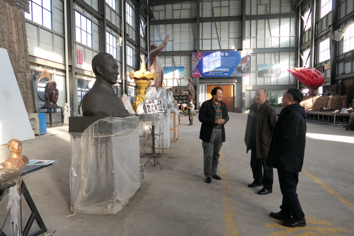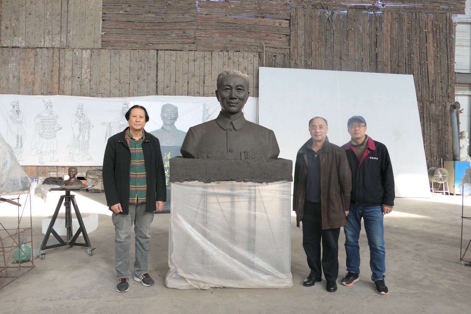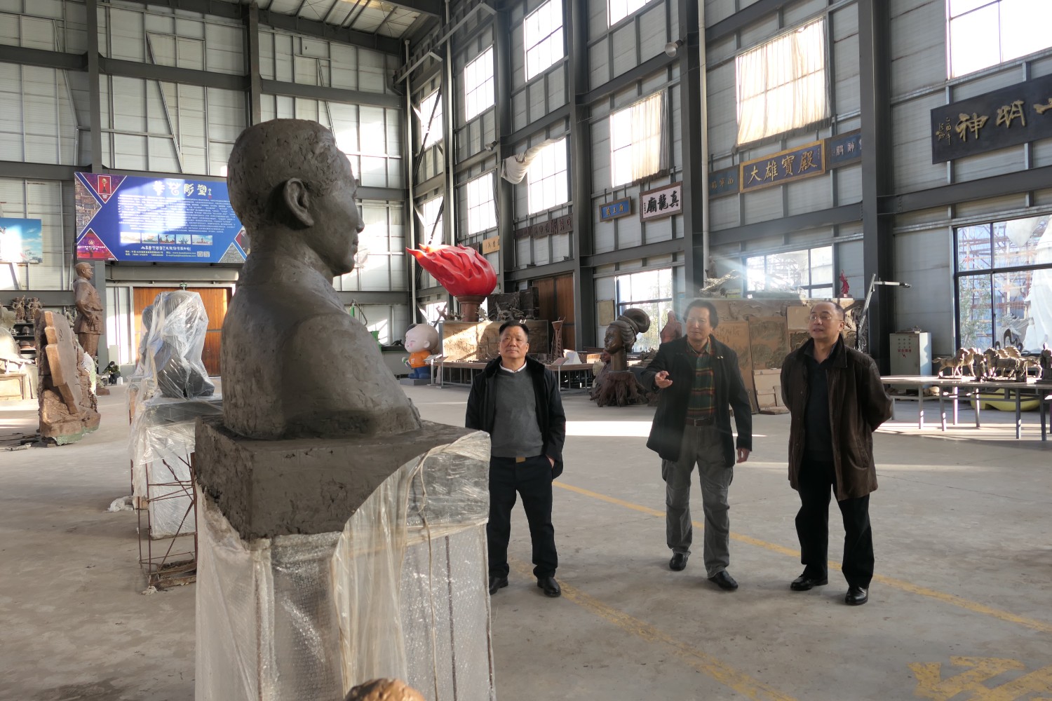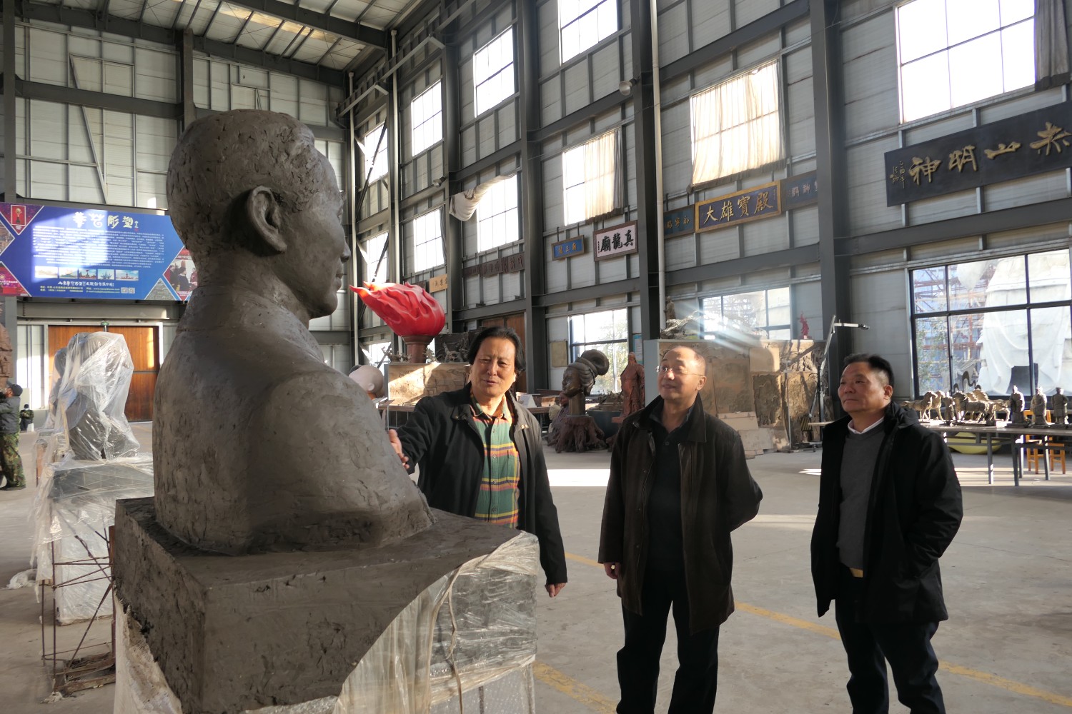 2021年11月16日,中國科學(xué)院心理研究所教授、文化與價值研究中心主任潘垚天博士,廣州潮起澳江文化有限公司黃順南董事長,蒞臨華藝指導(dǎo)驗收潘菽雕像泥塑。潘菽雕塑由國大師傅紹相設(shè)計,傅總與兩位嘉賓親切交流雕塑藝術(shù)。