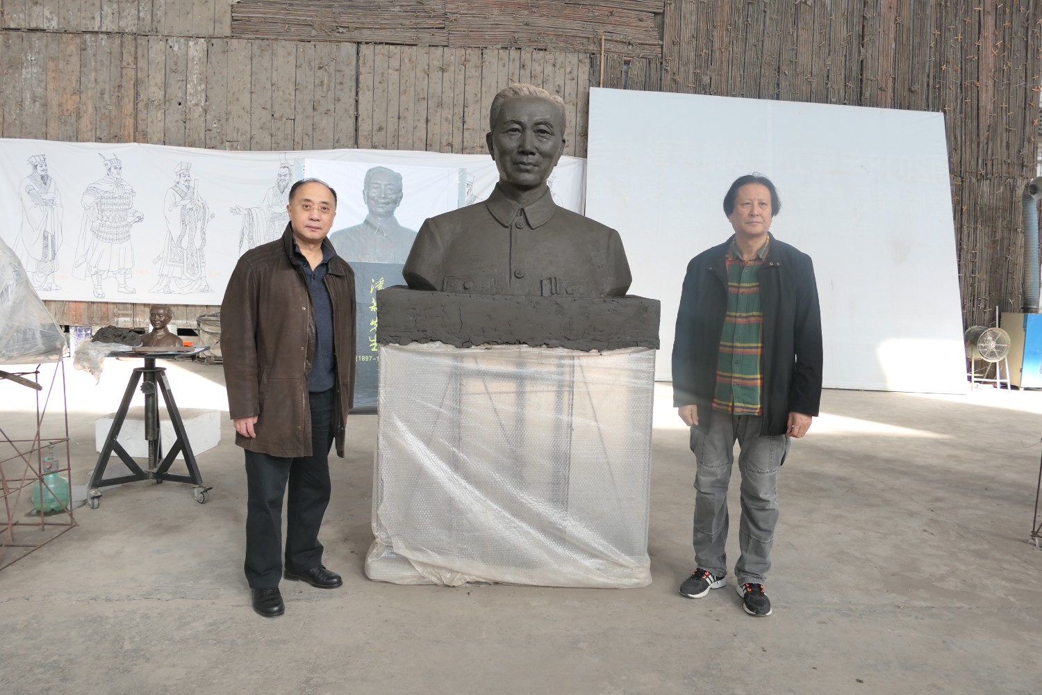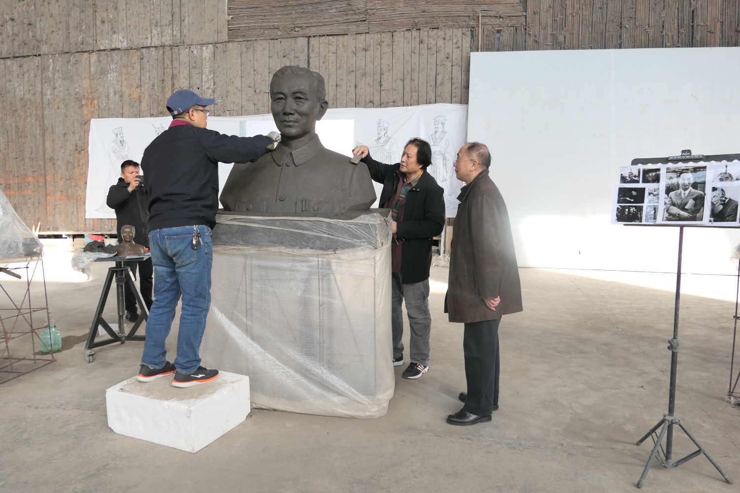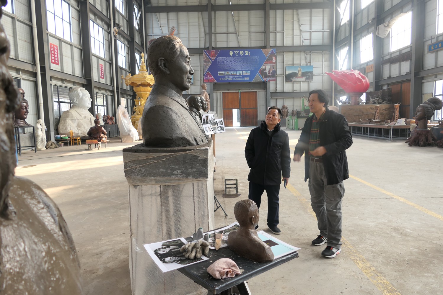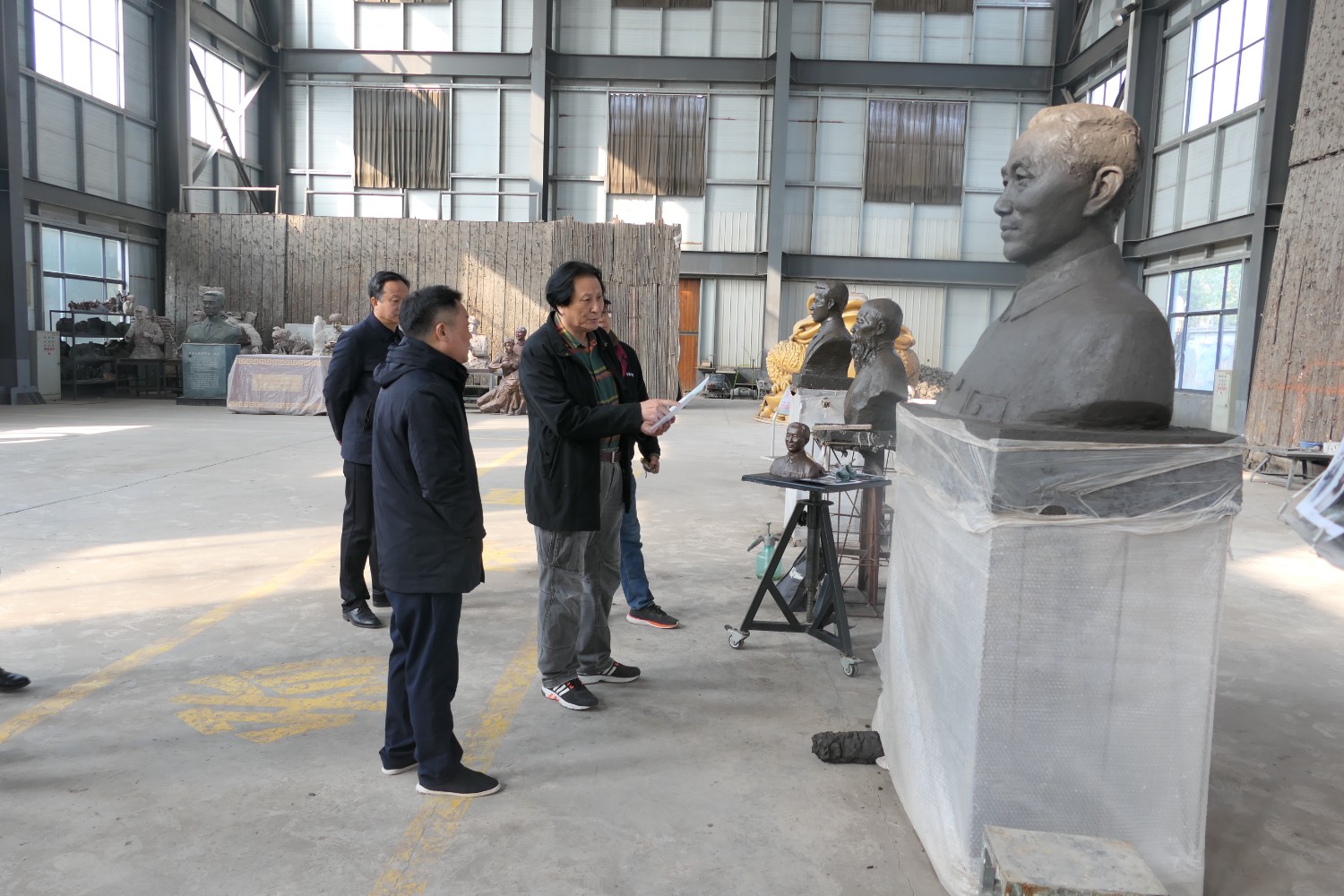 2021年11月16日,中國科學(xué)院心理研究所教授、文化與價值研究中心主任潘垚天博士,廣州潮起澳江文化有限公司黃順南董事長,蒞臨華藝指導(dǎo)驗收潘菽雕像泥塑。潘菽雕塑由國大師傅紹相設(shè)計,傅總與兩位嘉賓親切交流雕塑藝術(shù)。