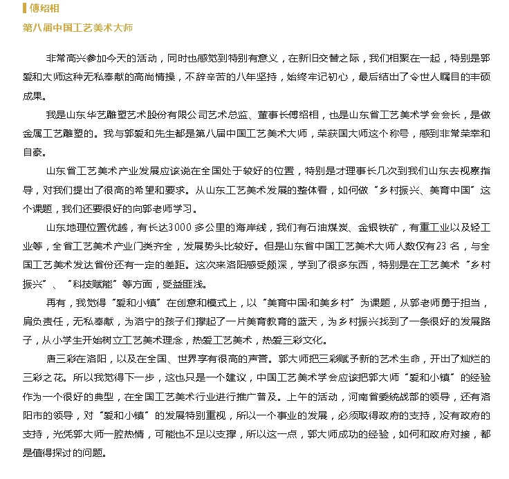 活動(dòng)期間,舉辦了“工藝·公益——中國工藝美術(shù)大師論壇”,以“中國工藝美術(shù)大師的社會(huì)責(zé)任與使命擔(dān)當(dāng)”為主題進(jìn)行交流。中國工藝美術(shù)學(xué)會(huì)黨委書記、理事長才大穎做了開題報(bào)告,與會(huì)的各位中國工藝美術(shù)大師先后發(fā)言,論壇由中國工藝美術(shù)學(xué)會(huì)黨委副書記王建良主持。中國工藝美術(shù)大師傅紹相出席活動(dòng),并在“工藝·公益——中國工藝美術(shù)大師論壇”講話發(fā)言,晚上參觀了洛陽古城麗景門古街。